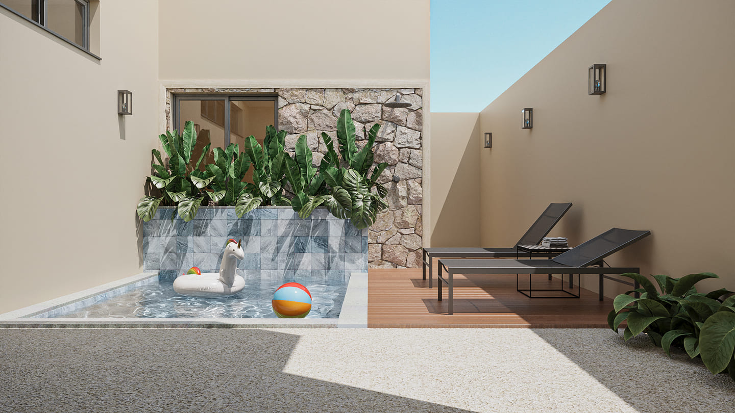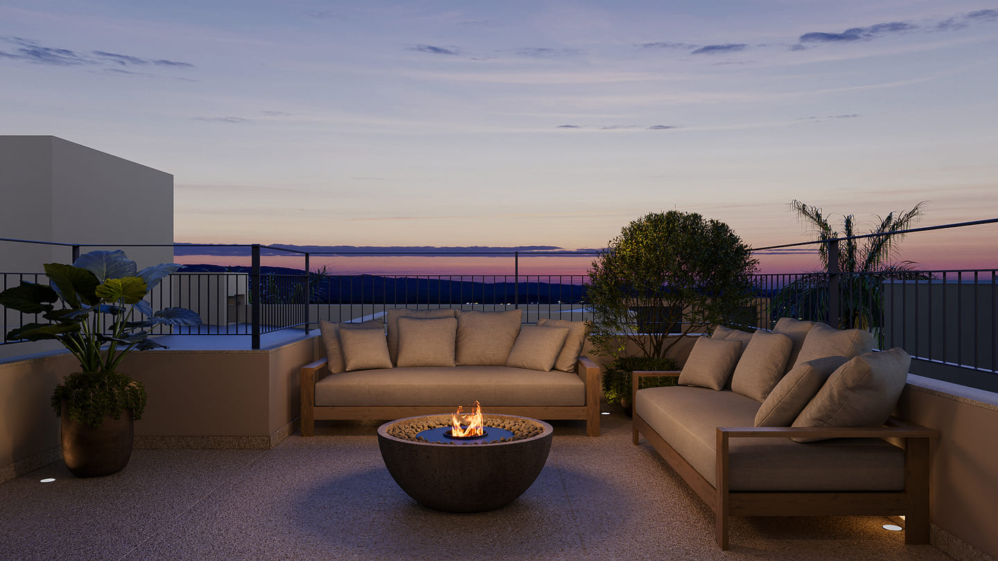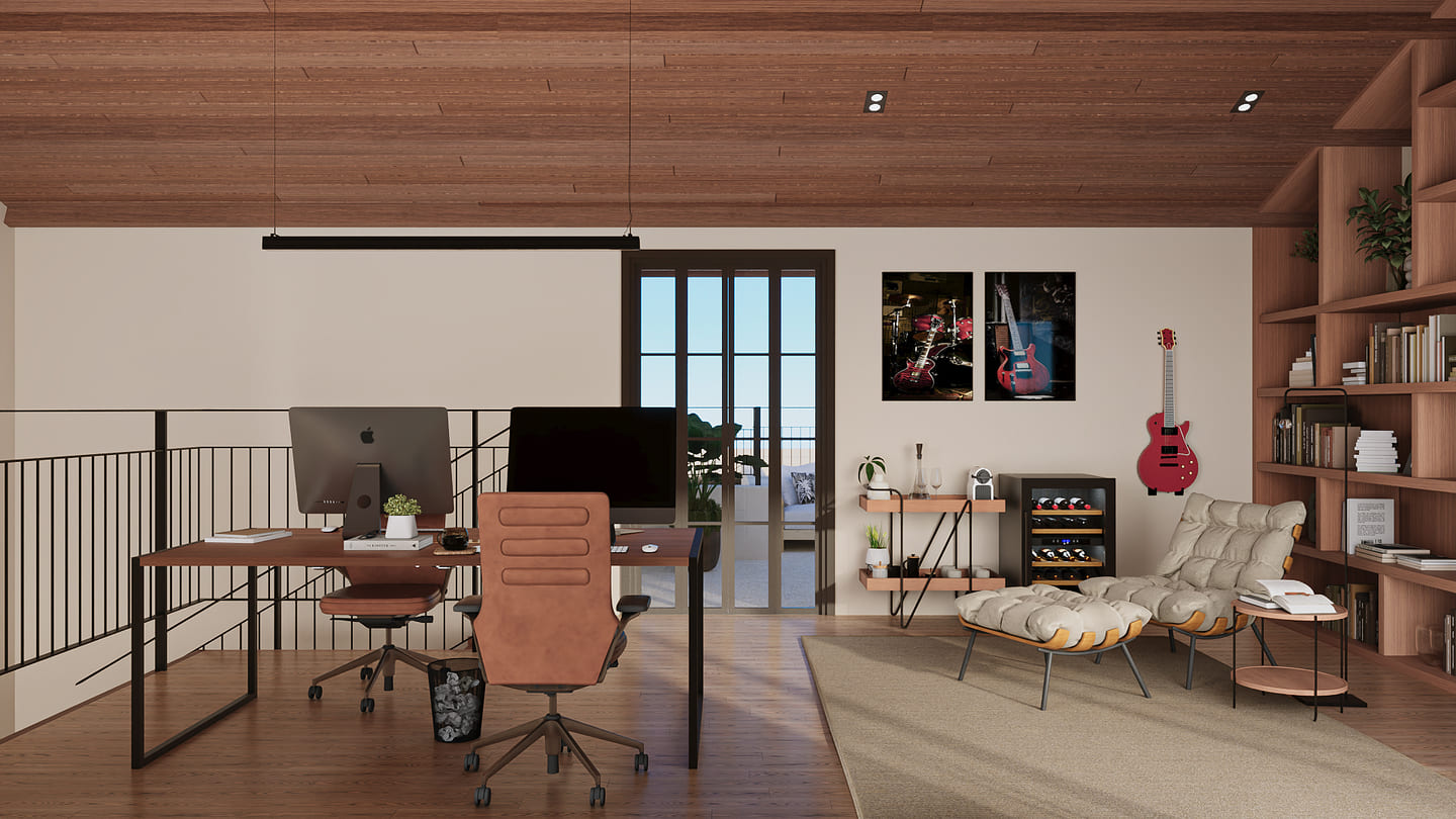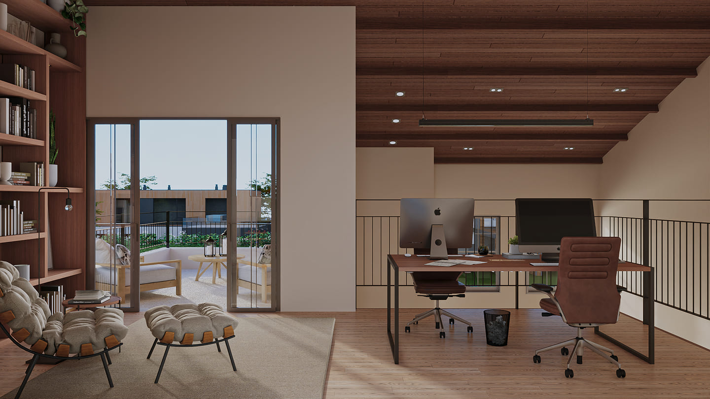 Com dois quartos, uma suíte com closet e sala de estar e jantar integradas, a casa ainda conta com uma cozinha especial com churrasqueira para momentos de celebração. E no mezanino, o escritório com a vista perfeita para toda a casa, com dois terraços, um voltado para a frente e outro para a piscina.