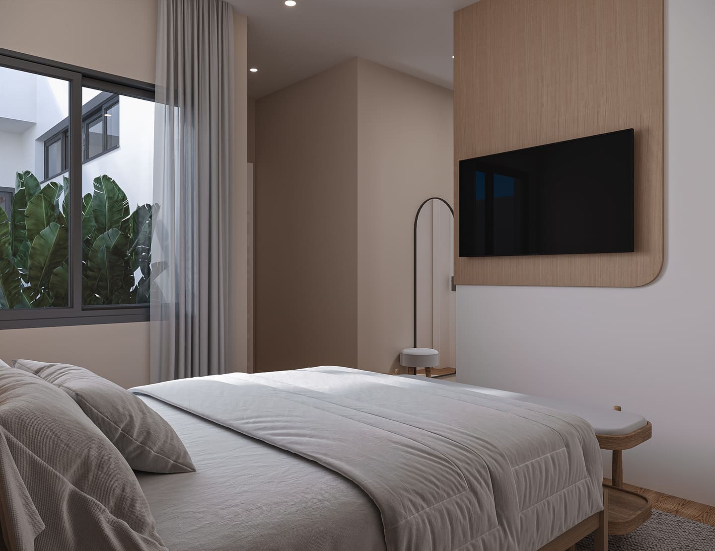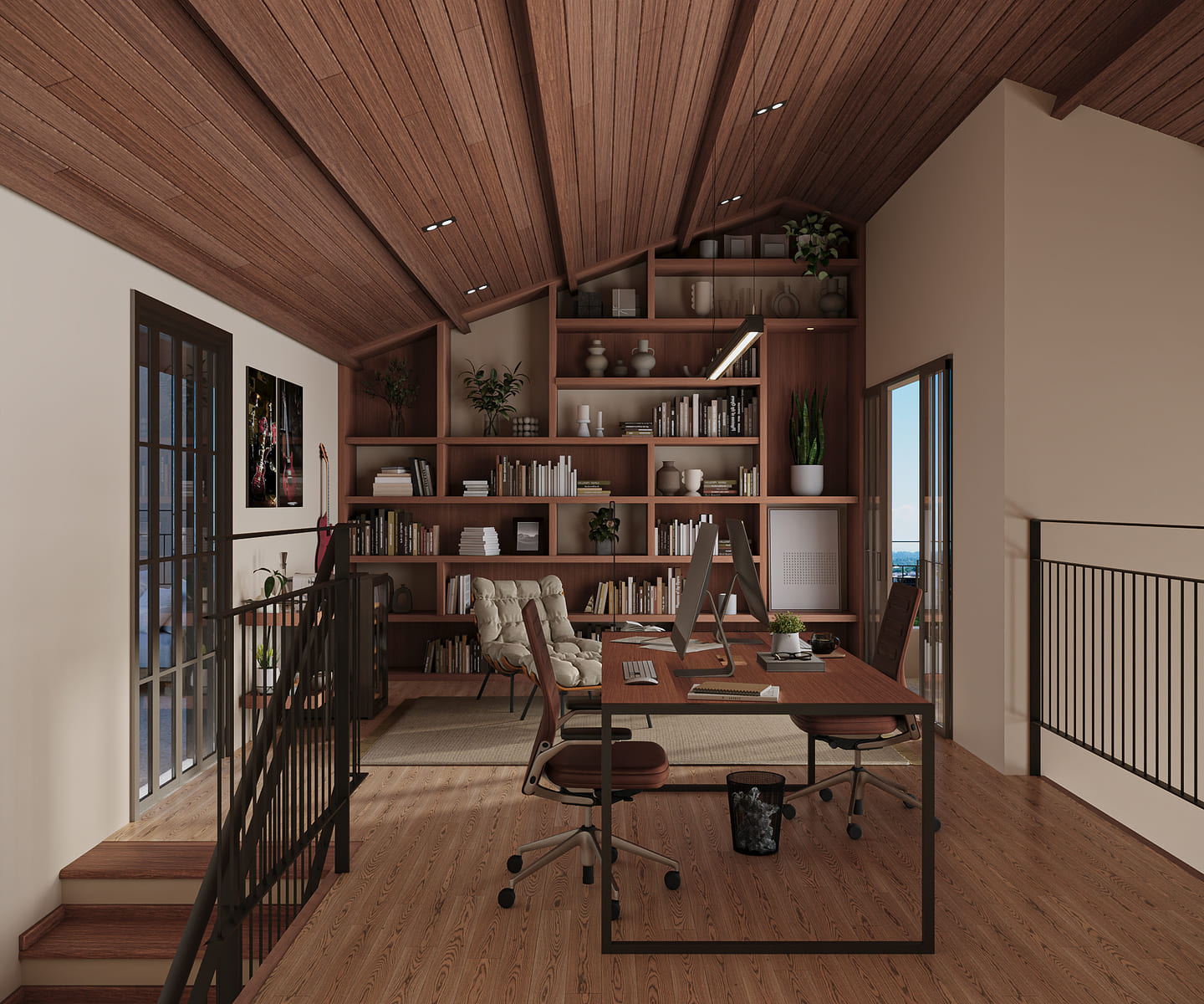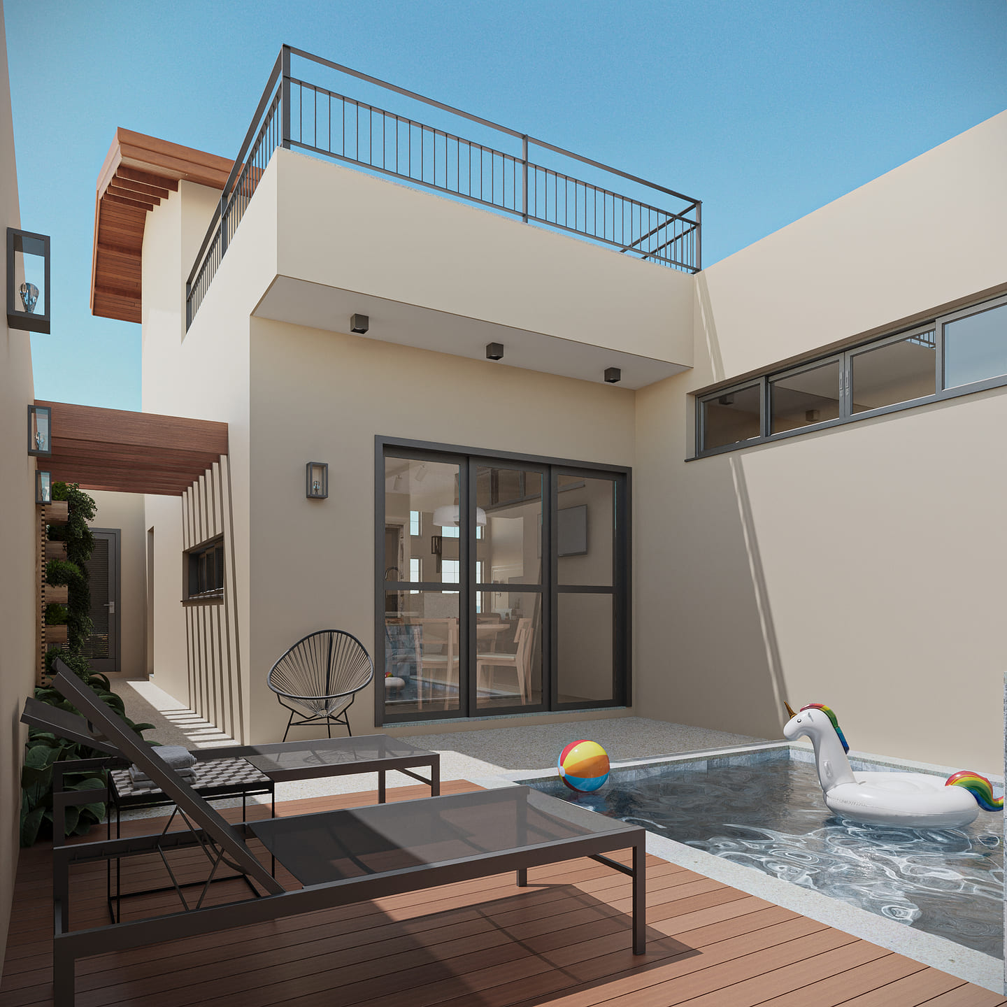 Com dois quartos, uma suíte com closet e sala de estar e jantar integradas, a casa ainda conta com uma cozinha especial com churrasqueira para momentos de celebração. E no mezanino, o escritório com a vista perfeita para toda a casa, com dois terraços, um voltado para a frente e outro para a piscina.